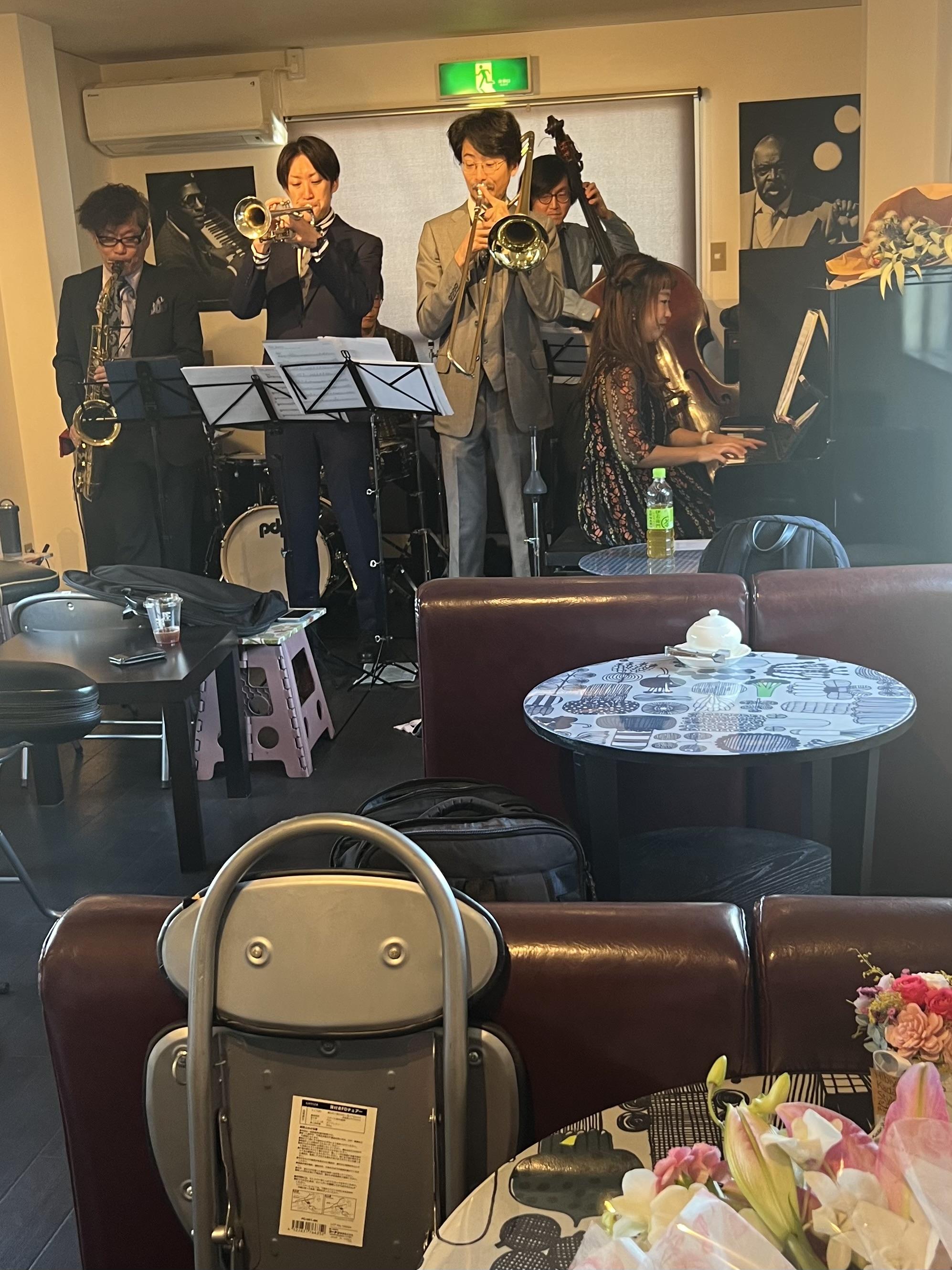 こじんまりしたディアロード店内に3管とピアノ、ベース、ドラムが鳴り響くのは爽快です。