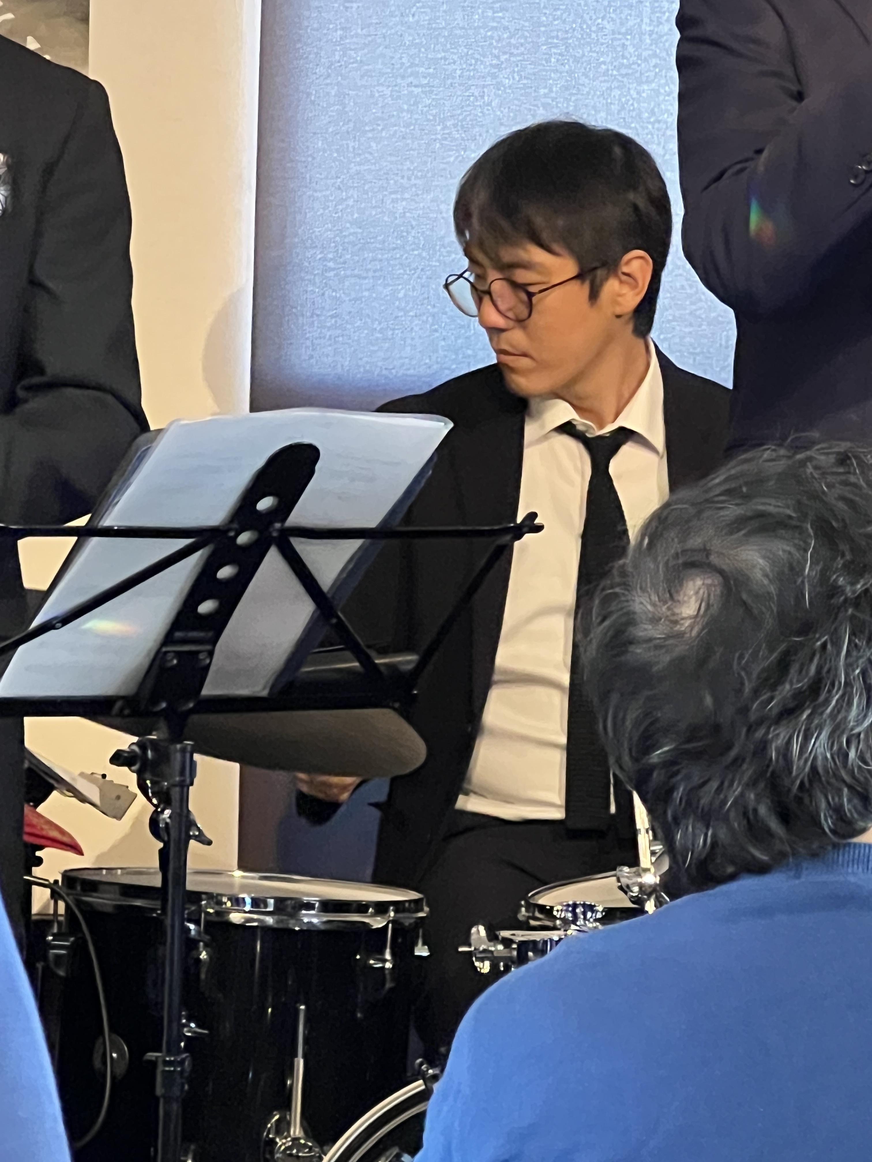 これまた欠かせぬ存在のドラマー、弦牧潔先生。3管に負けない迫力のドラムを弦牧ファンと共に聴かせて頂きました。