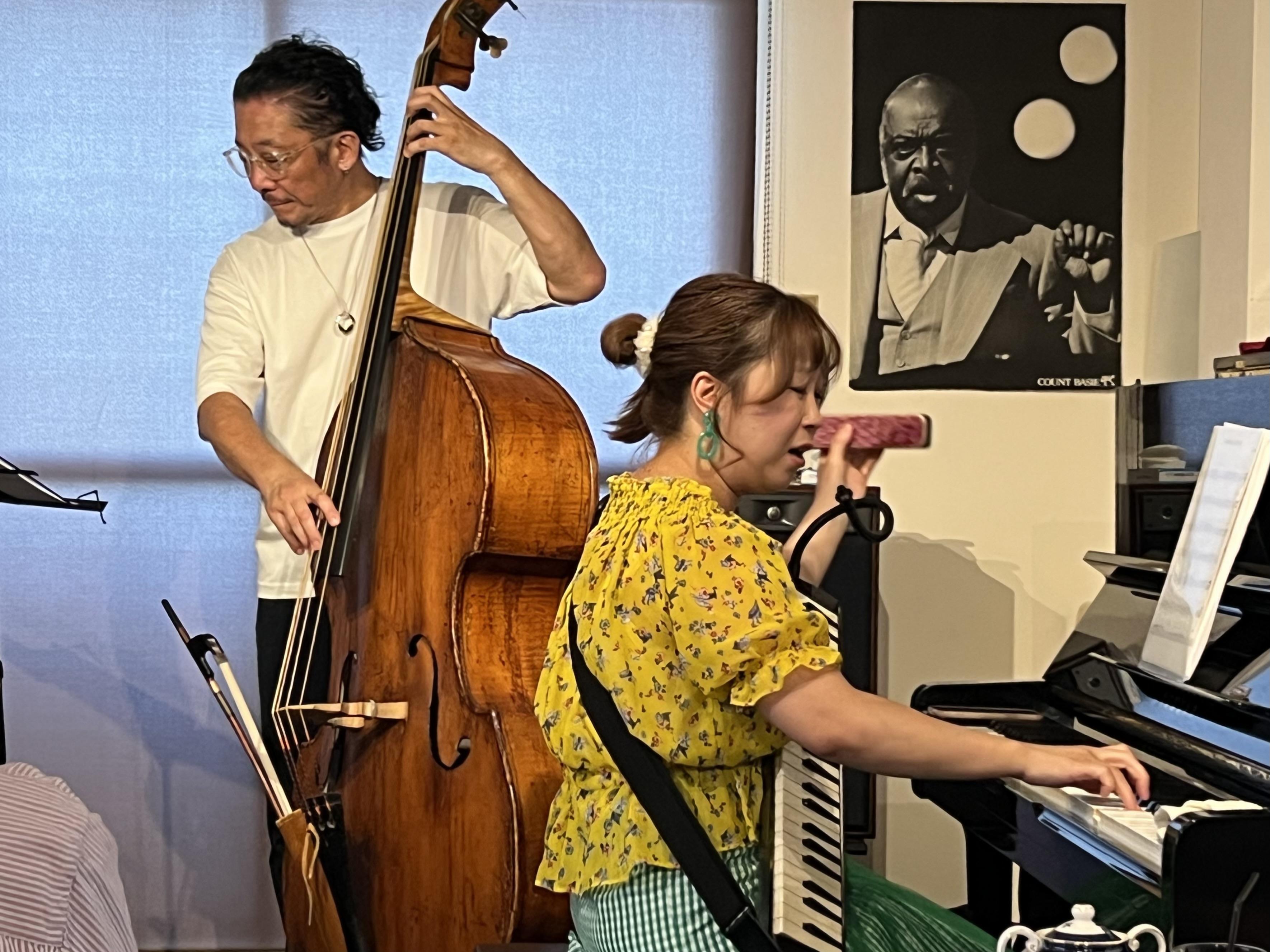 そんな神田さんとの演奏がマッチする能勢さんですが、「Tea for two」では清水さんと、少し高い音で、しかも透き通った声でハモってくれました!(「嘘だろ」と思う方は、どこぞで能勢さんのハモりを聴いてみてください)「Moonlight Serenade」他能勢さんのスインギーな爪弾きにマダム軍団は拍手を送っていました。