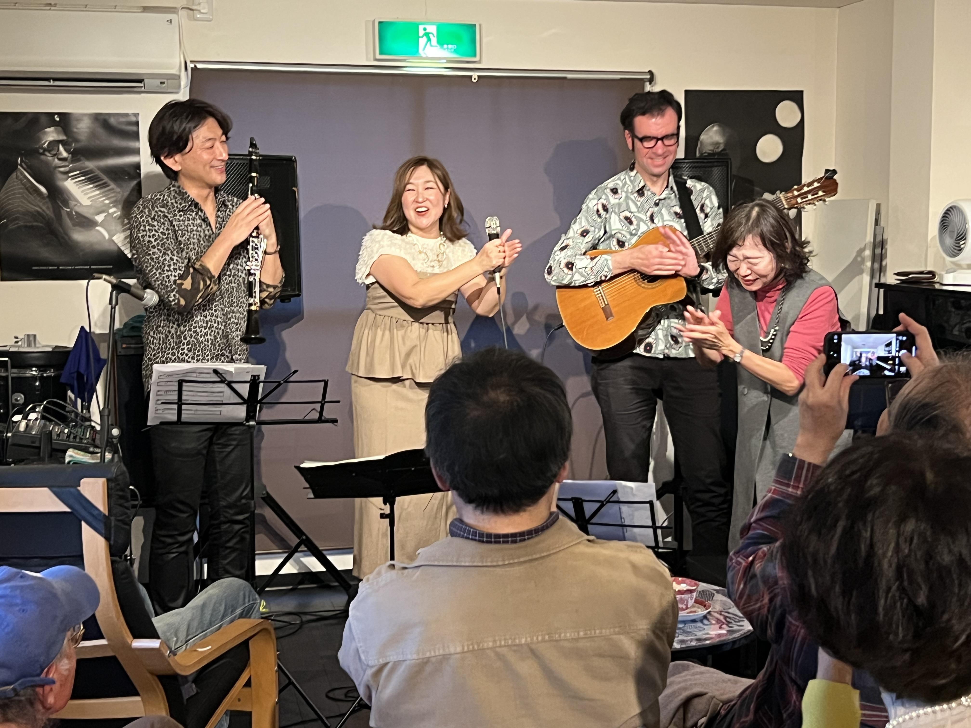 快速のスキャット挟み、流暢な英語で瑞々しく、時にアンニュイに、歌ってくれた東さん。鶴見区出身で、現在の住まいも(放出と同じ)学研都市沿線。お客様の中には、鶴見緑地公園近くの小学校時代の担任の先生が聴きにきてくれていて、ライブ後は歓談に花がさきました。