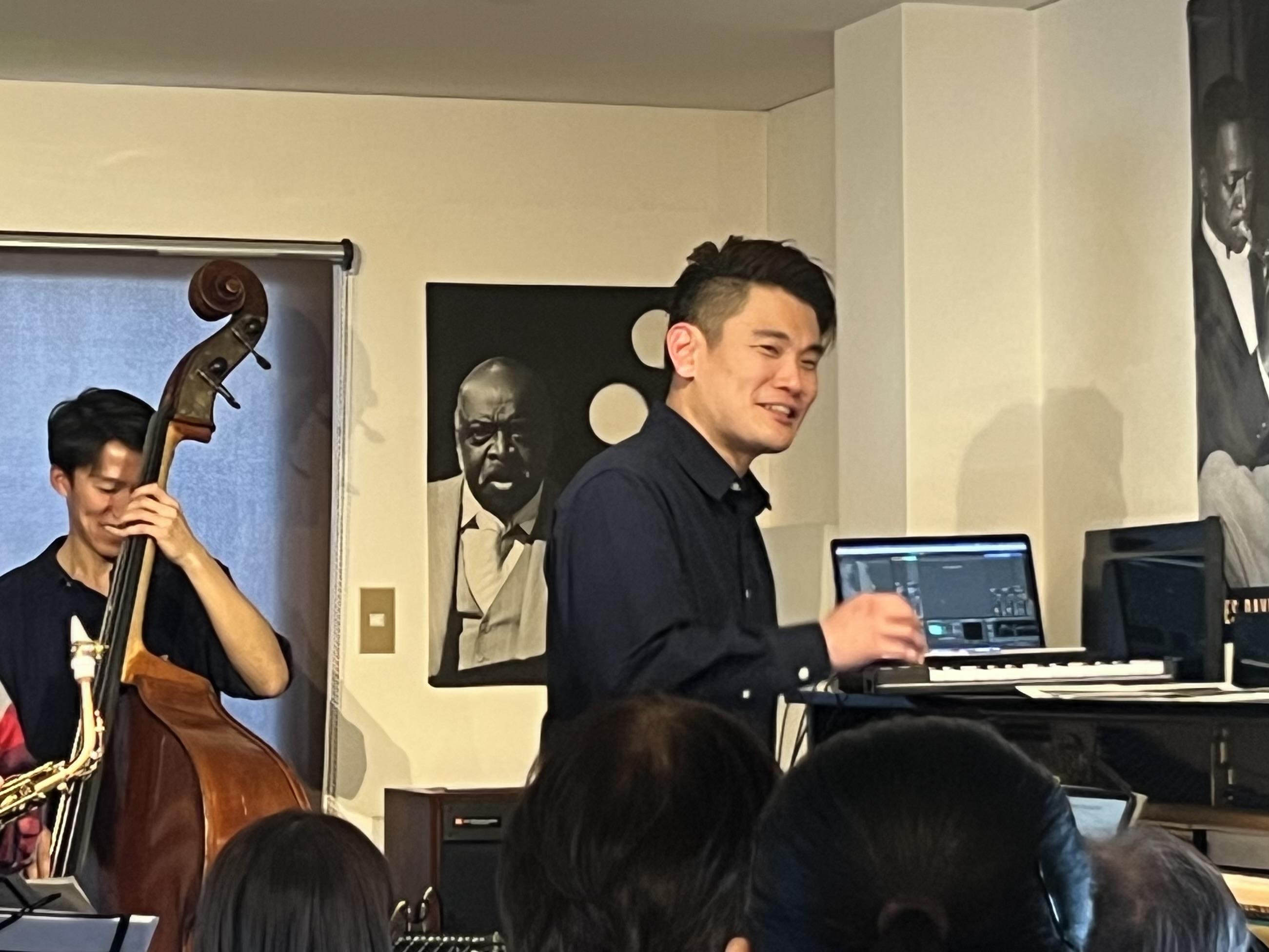 今回カルテットのリーダーとして選曲、アレンジを冷静に、そしてピアノソロを冷静且つ熱く狂喜しつつプレイし続けた杉山ピアニスト。今回の「I Mean You」などは後半1小節ごとに、4/4拍子、5/4、4/4、5/4、3/4と変化!