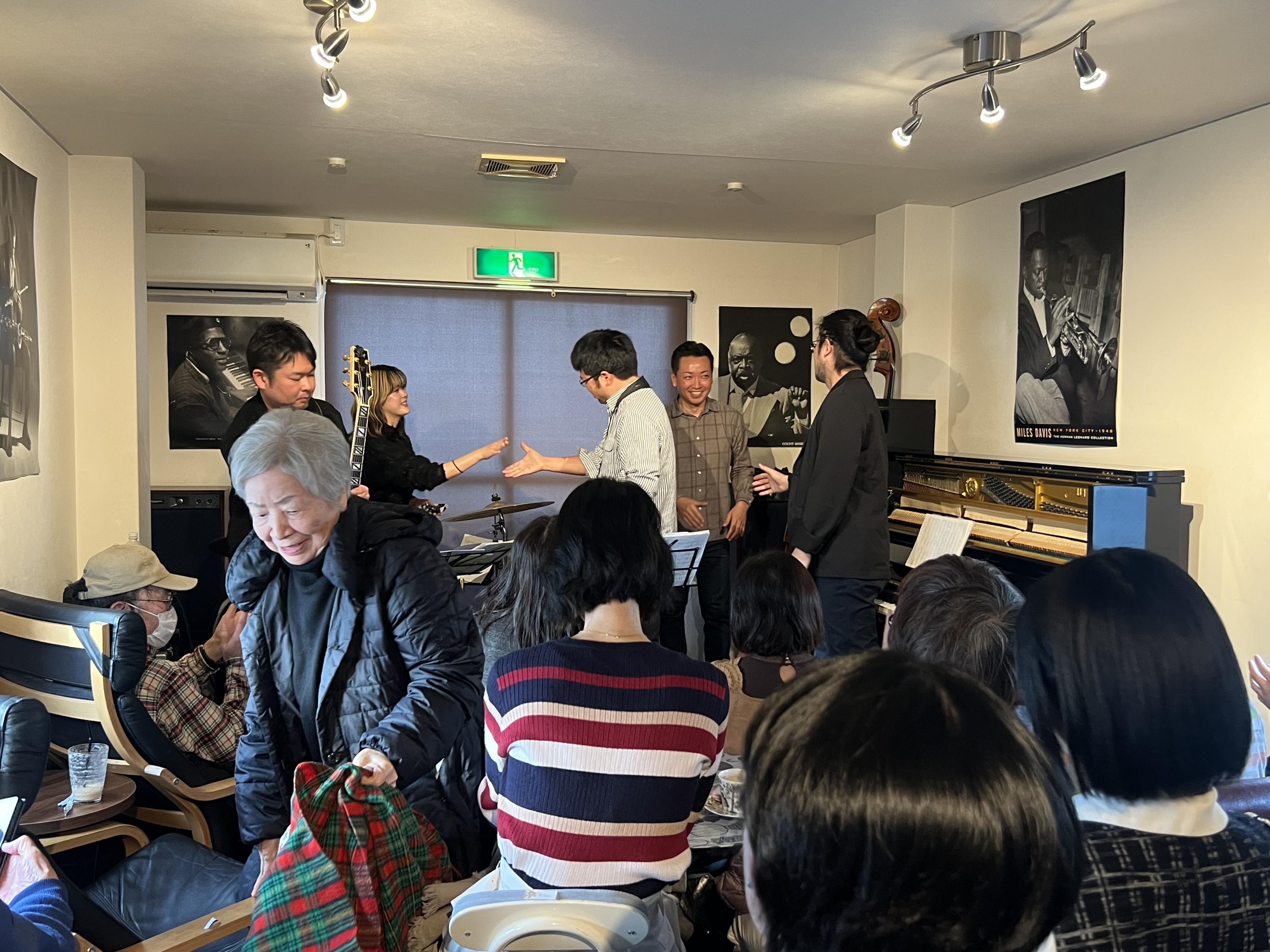 響く宮野ベースで始まり、宮野ベースで終わった「On the Brink(崖っぷち)」。ミステリアスな風が漂っていて、エンドは早川ドラムが入り、加納ピアノも入り、うまく言えませんが、めちゃめちゃカッコイイ終わり方でした。(嘘だとお思いなら、いちど演奏を聴いてみて下さい)