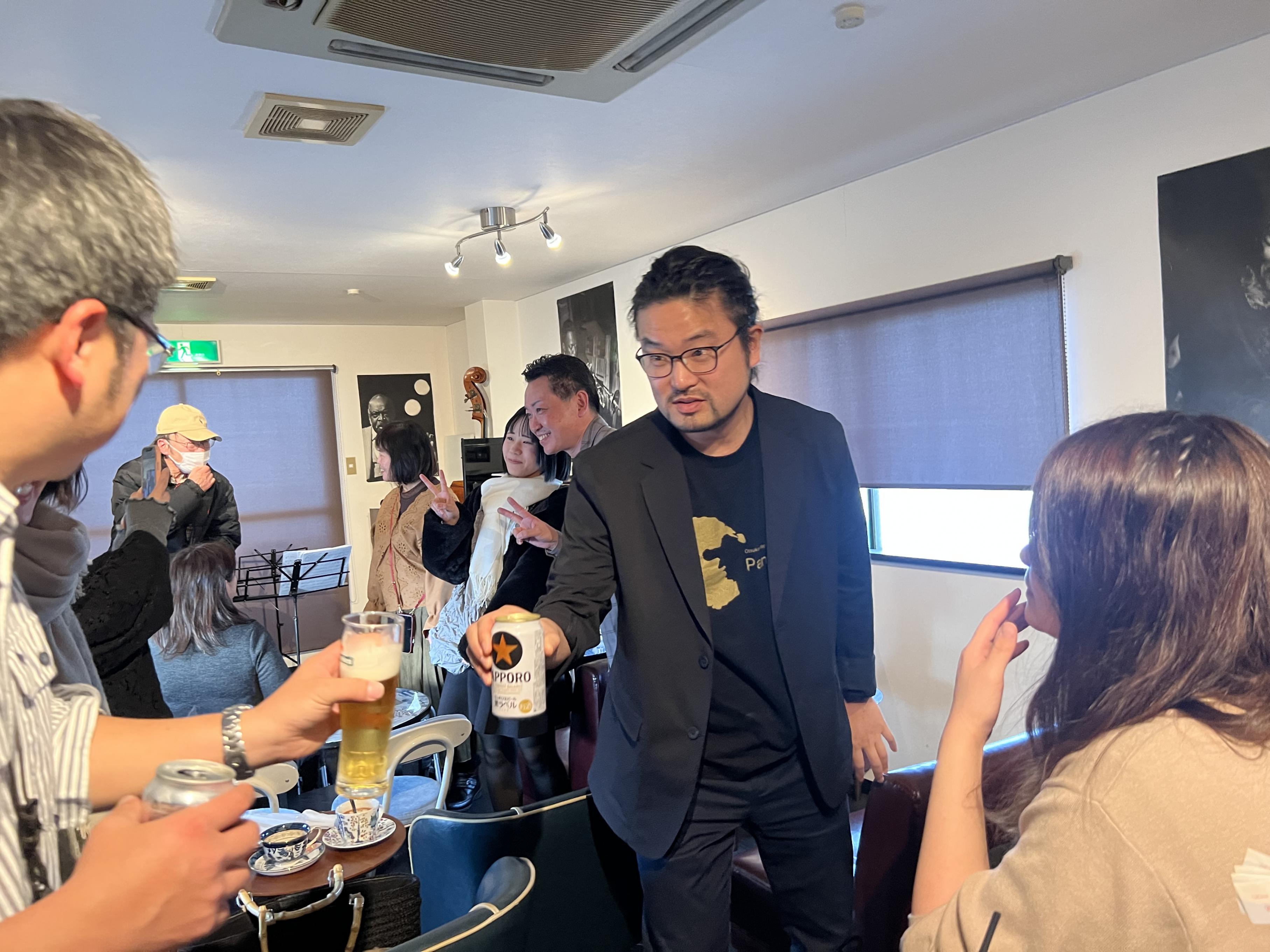 一週間前の「後方、席空いてます」状態から→ライブ始まる前には超満席となり(ドア近くは混み、申し訳ありません)外は体感温度5℃の寒さでしたが、店内では暖房を止めました。