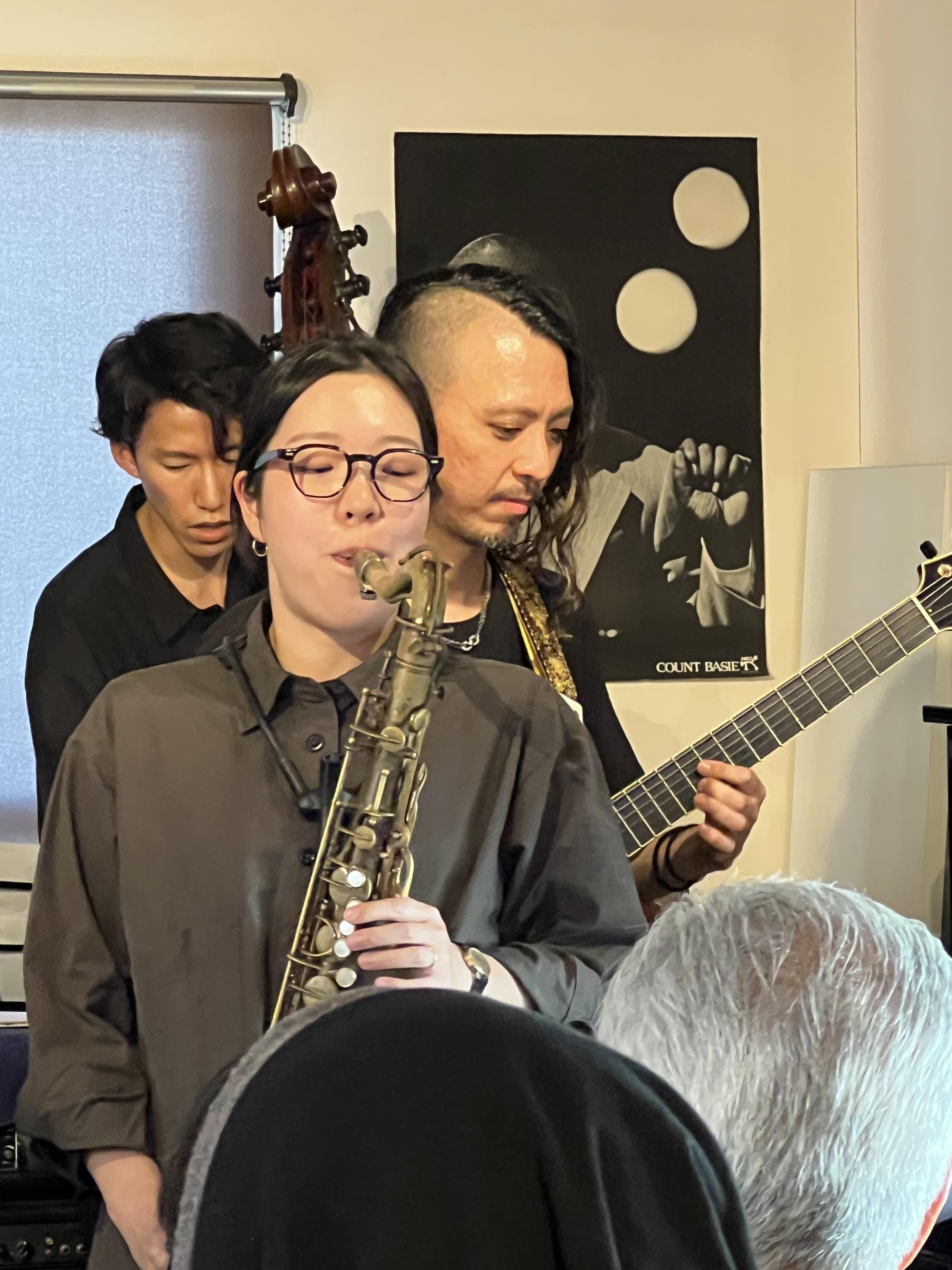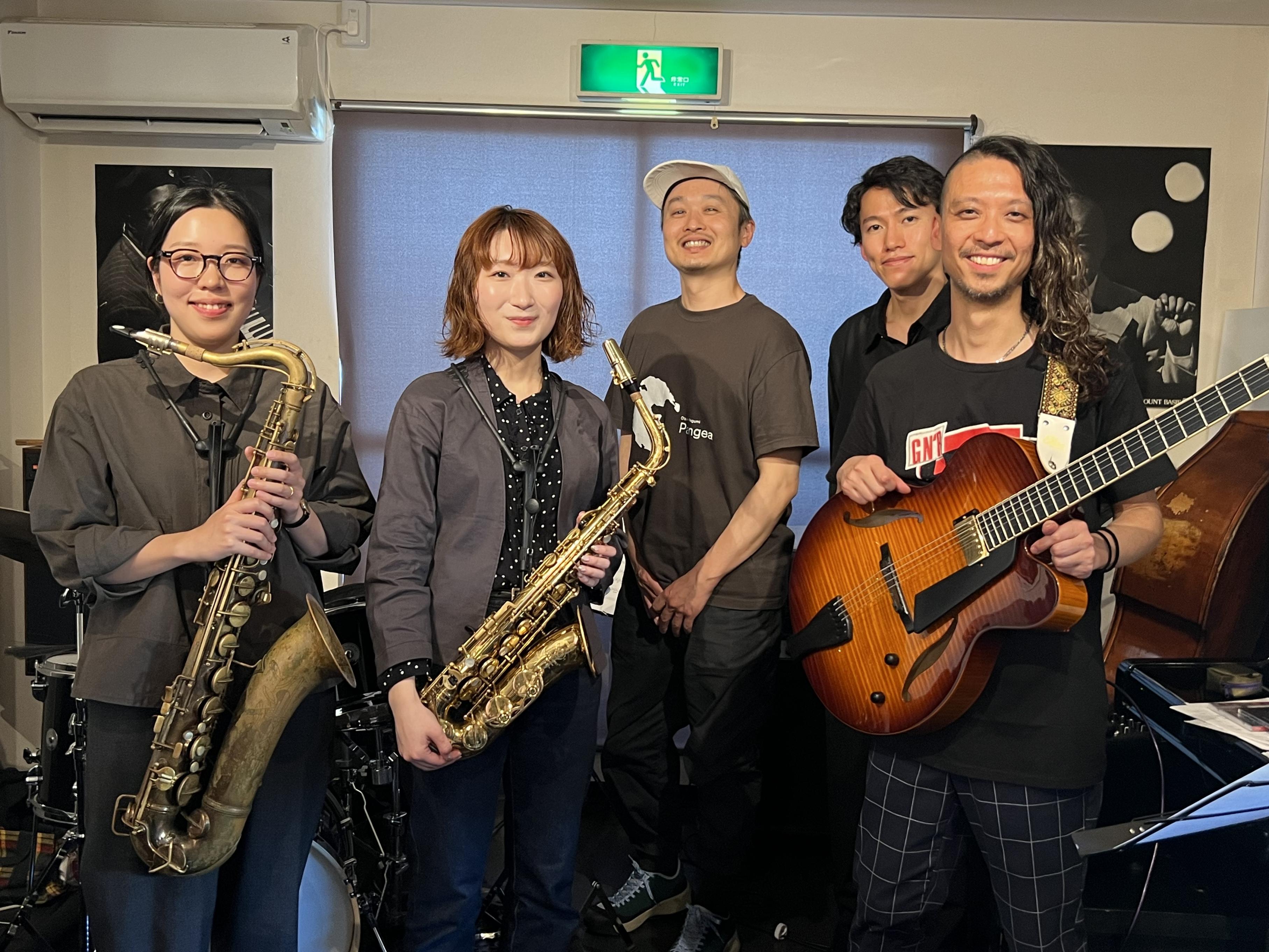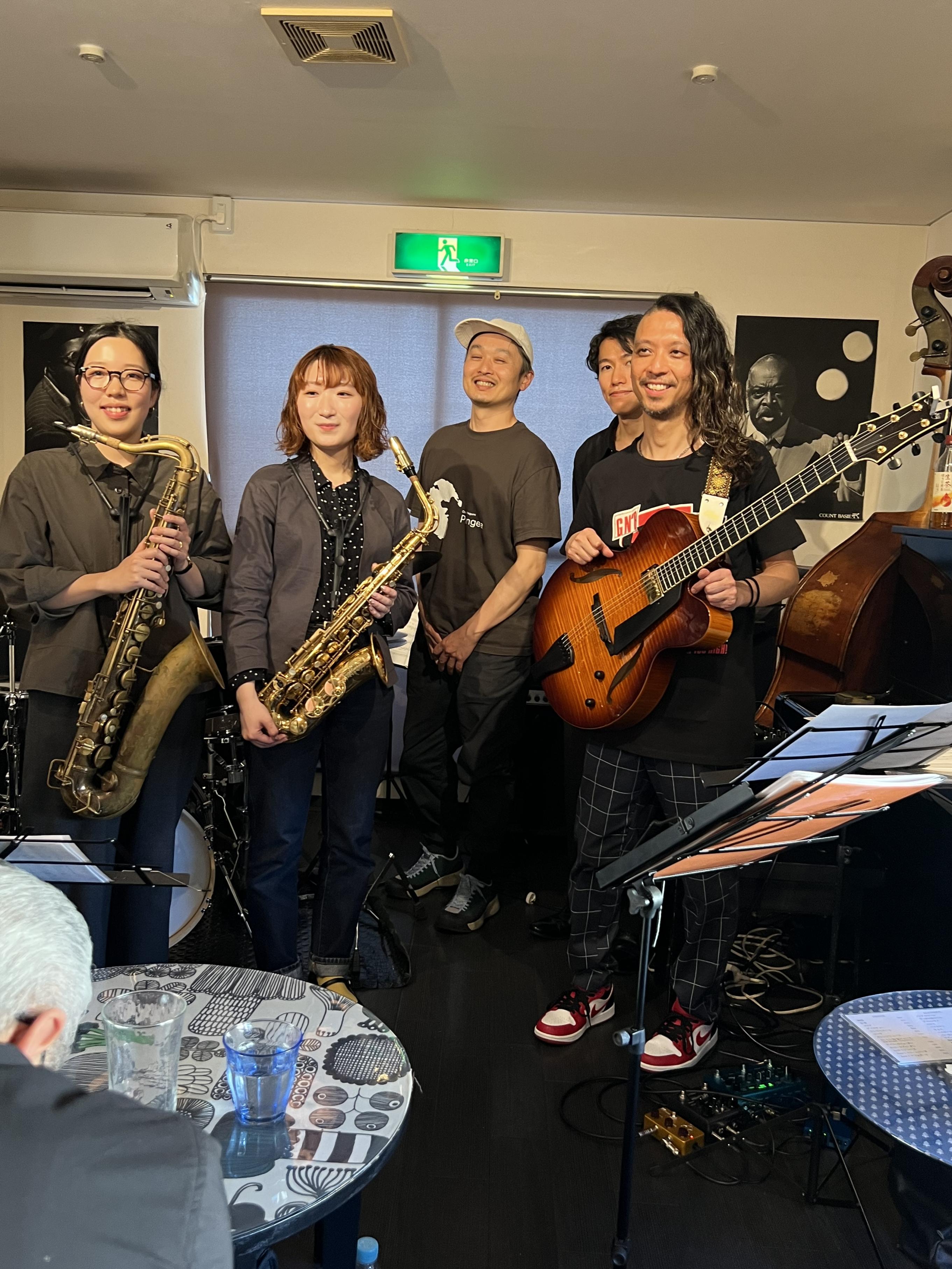 昨日は薮下ガククインテット~薮下ガク(g)米田あゆ(as)佐藤絵美里(ts)中村雄二郎(ds)梅本慈丹(b)~ライブを開催しました。