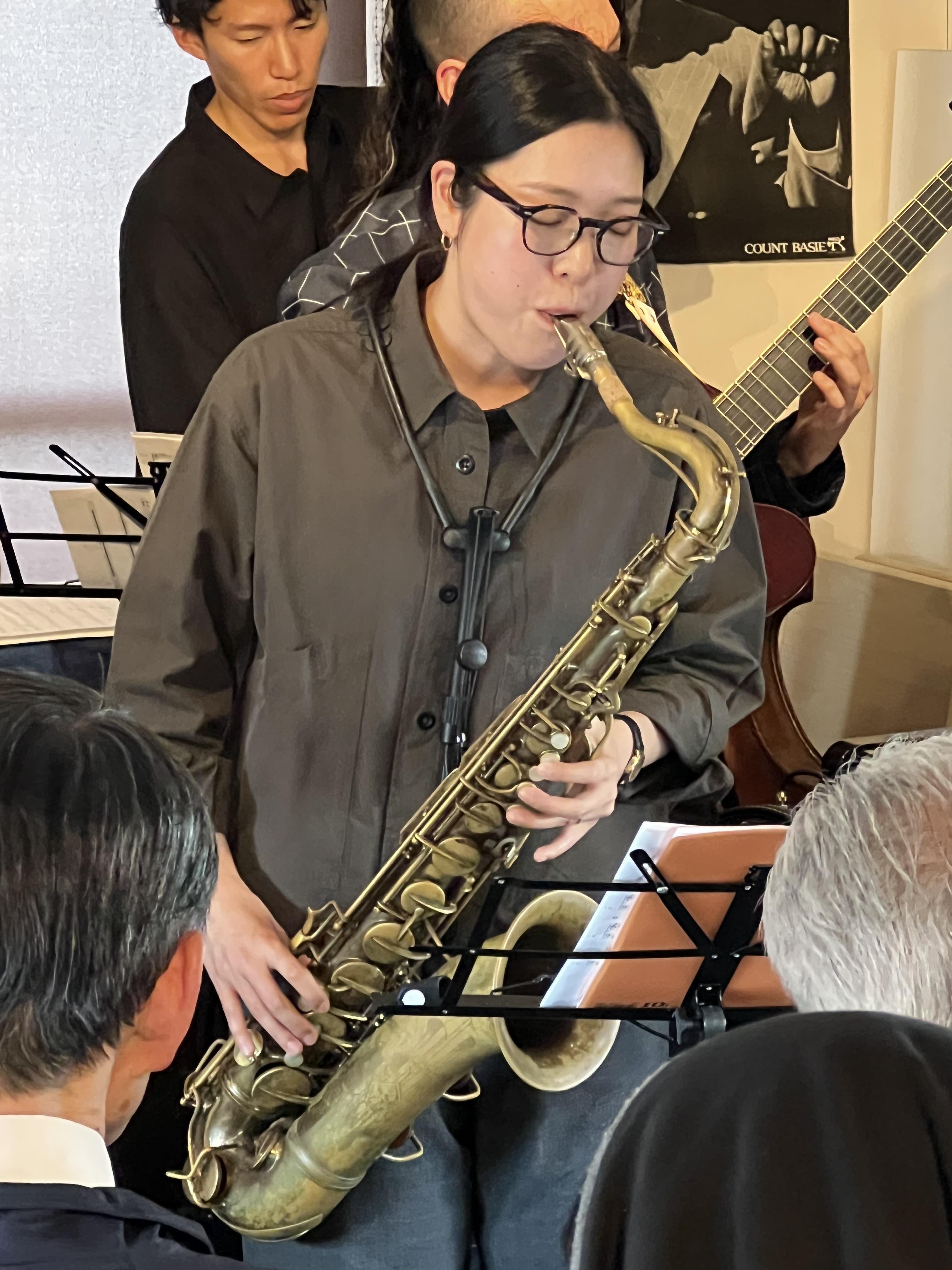 テナーの佐藤絵美里さんは、1曲目の「Days of wine ~」では、春に溶け込むようなふっくらした良いテナー音で、又2nd「60’s blues」ではストレートなアドリブ全開、バックの熱い中村&梅本リズム隊の演奏に乗り、素晴らしいソロを聴かせてくれました。